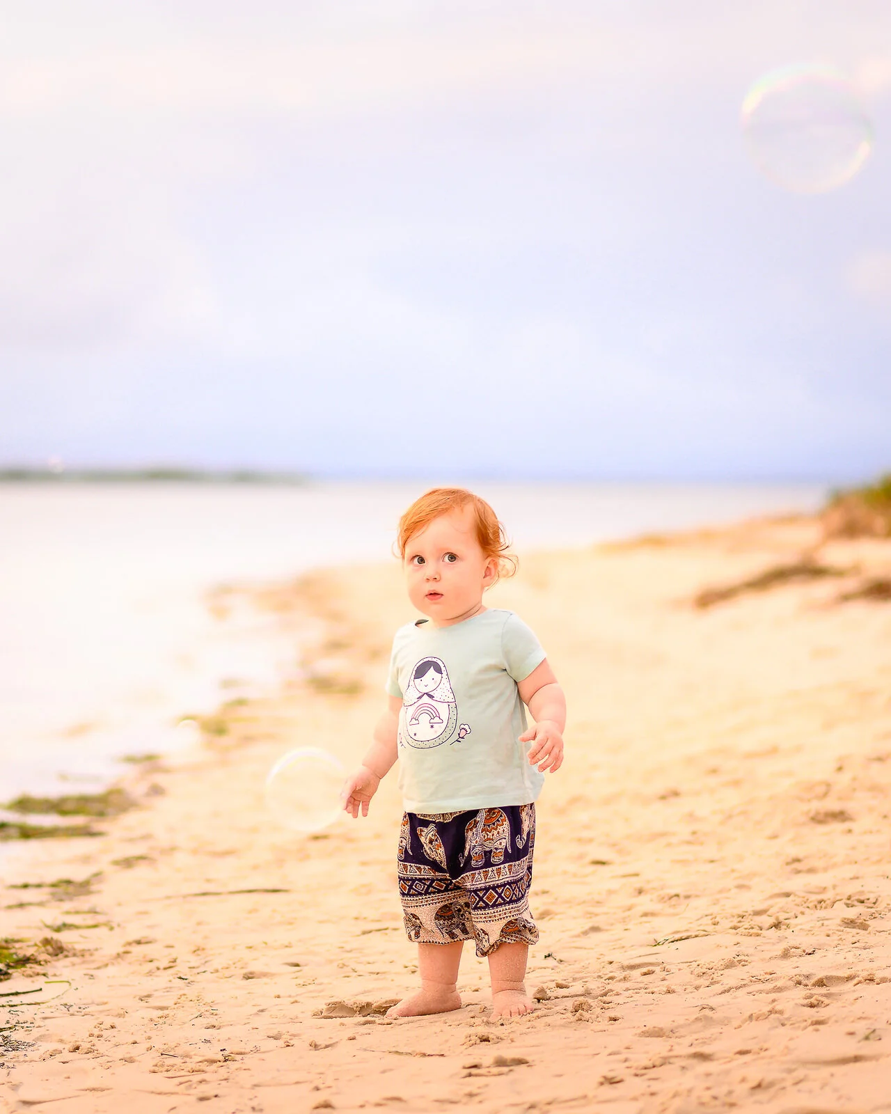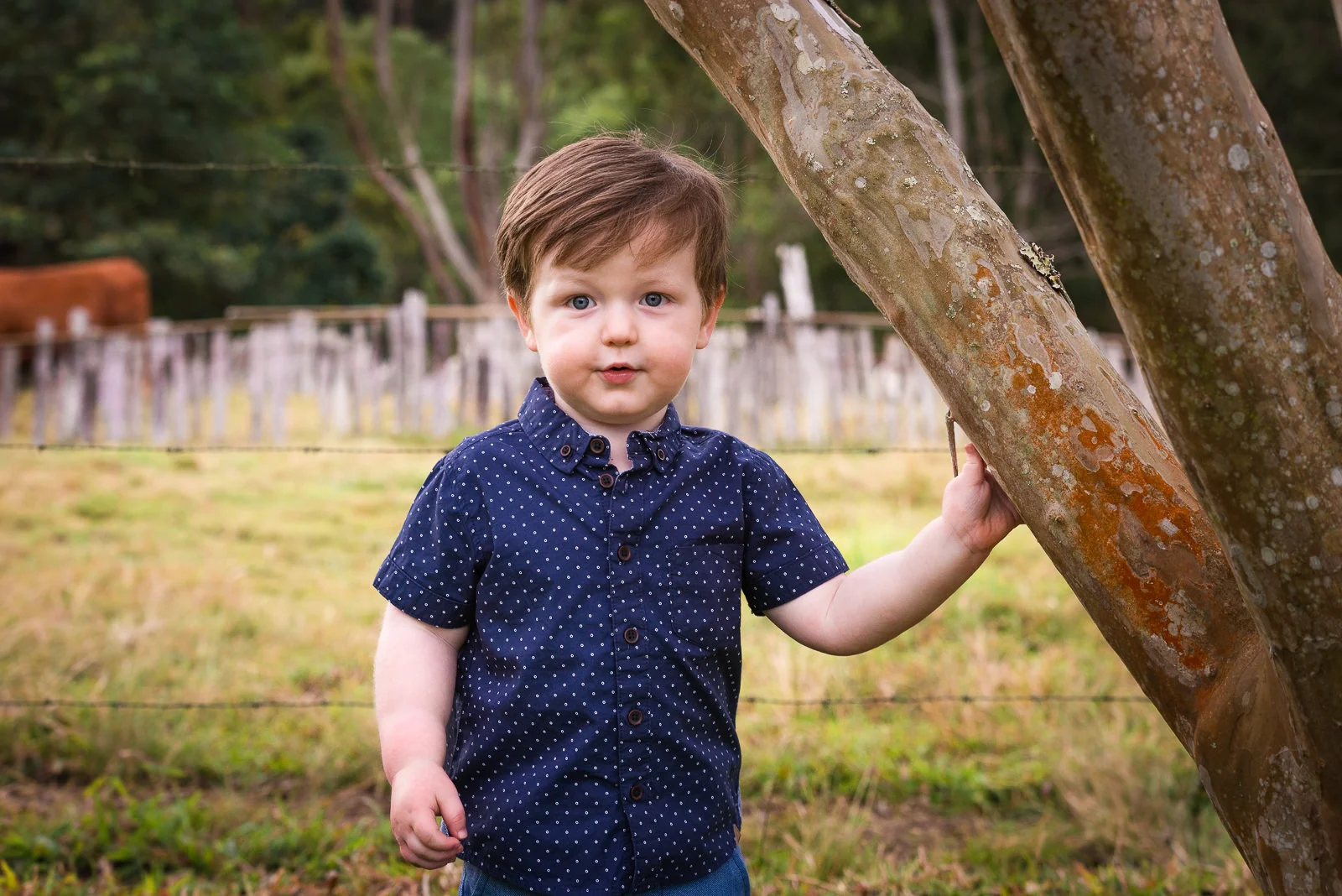 At the end of a very long quiet dirt road we were able to ease gently into the photo shoot. I needed to make James comfortable and trust me, we bonded over dinosaurs and played little games to keep his interest. I had the above image planned out and prepared a vintage timber crate to sit on, I love how the rows of macadamia trees in the grove give contrast to the bright golden sunlight coming in from the side.