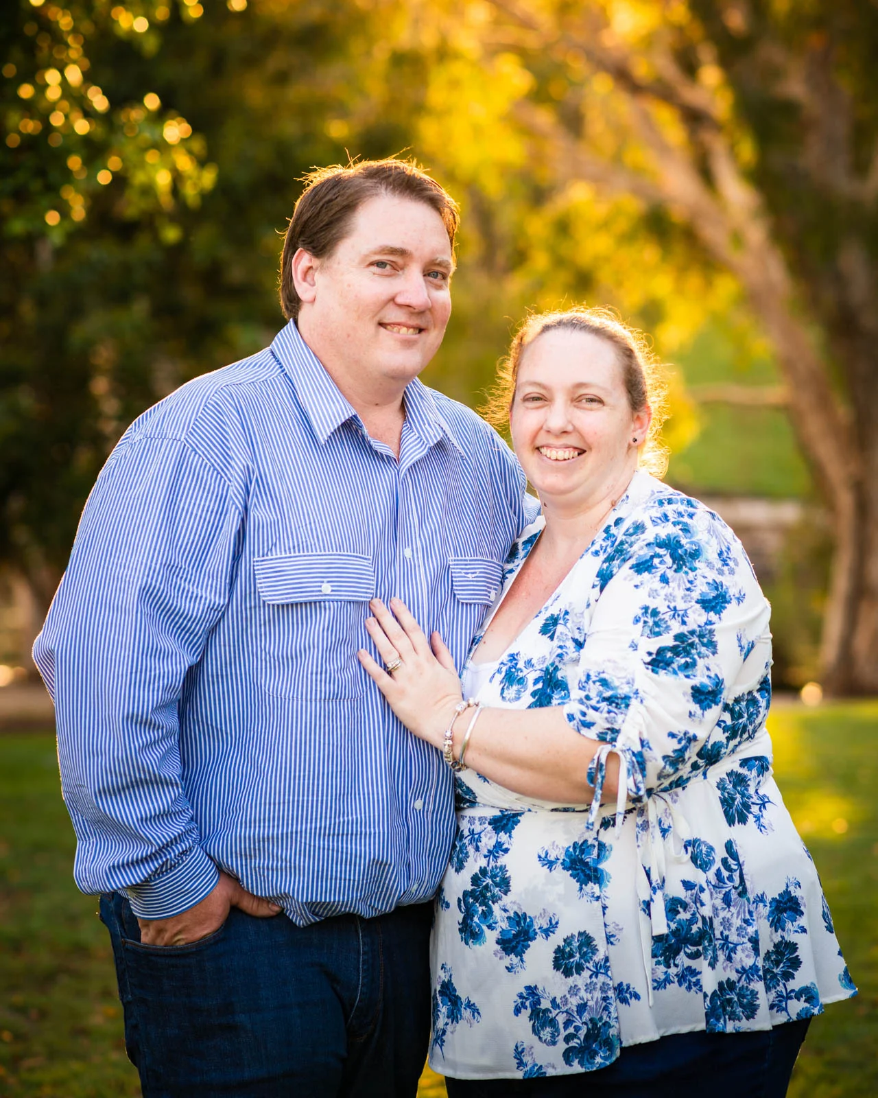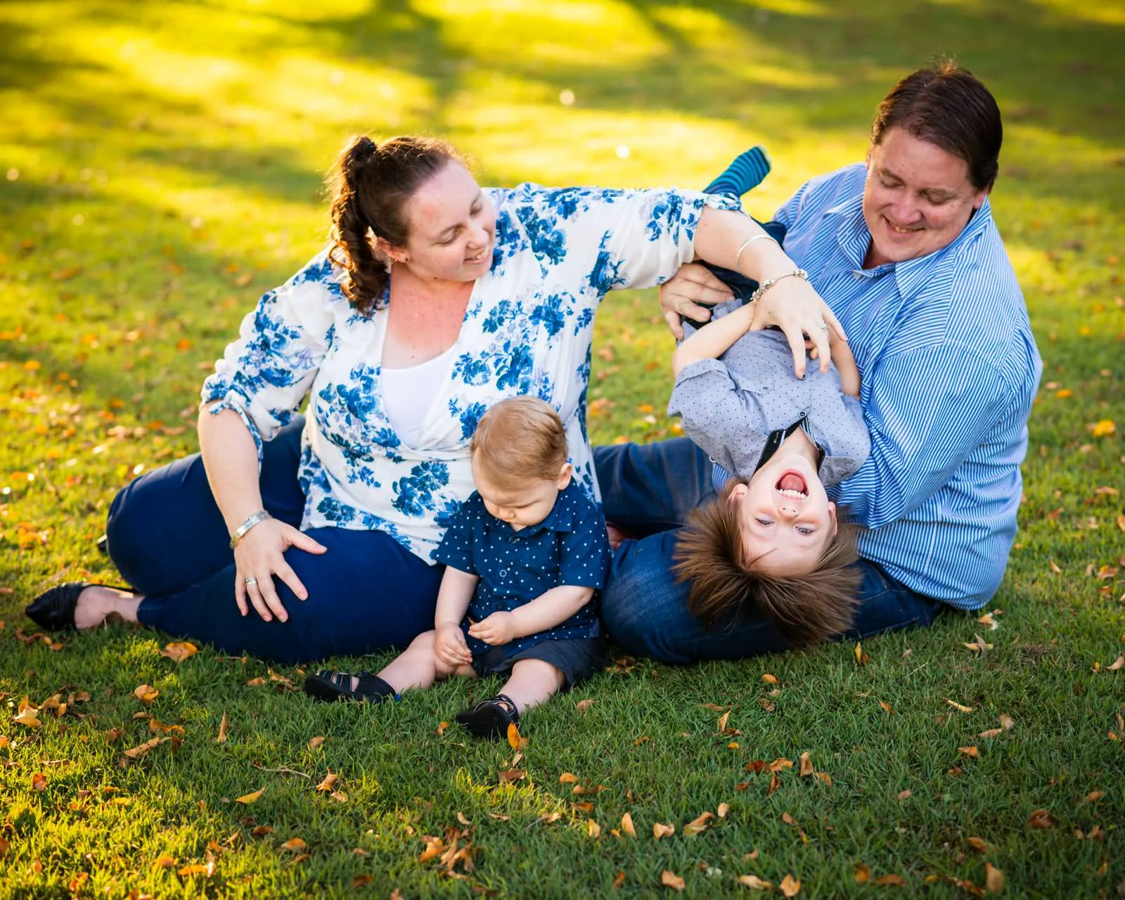 family portrait in golden sunlight at Centenary Lakes, Caboolture