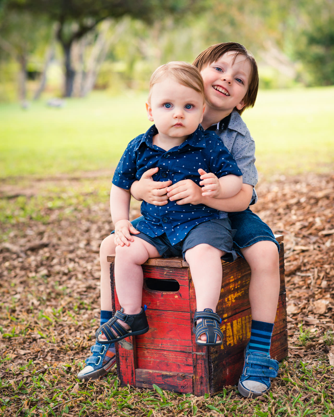 family portrait of brothers sitting on a vintage timber crate at Centenary lakes Caboolture